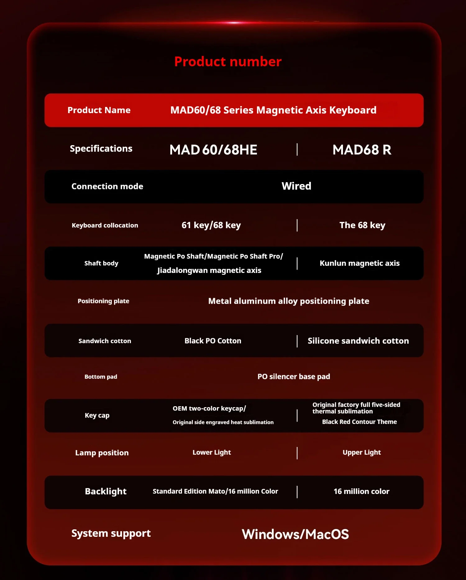 Engineered for competitive gaming, the MAD60 delivers precision performance through magnetic axis switches with 0.1ms ultra-low latency and a 128K scanning rate. This 61-key compact keyboard features a premium aluminum shell, customizable RGB backlighting with 16 million colors, and multiple magnetic switch options including Magnetic Jade and Magnetic King variants. The metal positioning plate and sound-dampening construction provide stability and refined acoustics. USB wired connection ensures zero wireless interference, while OEM keycaps with heat-sublimated legends offer durability. Compatible with Windows and MacOS, it's built for esports-grade responsiveness without compromise.